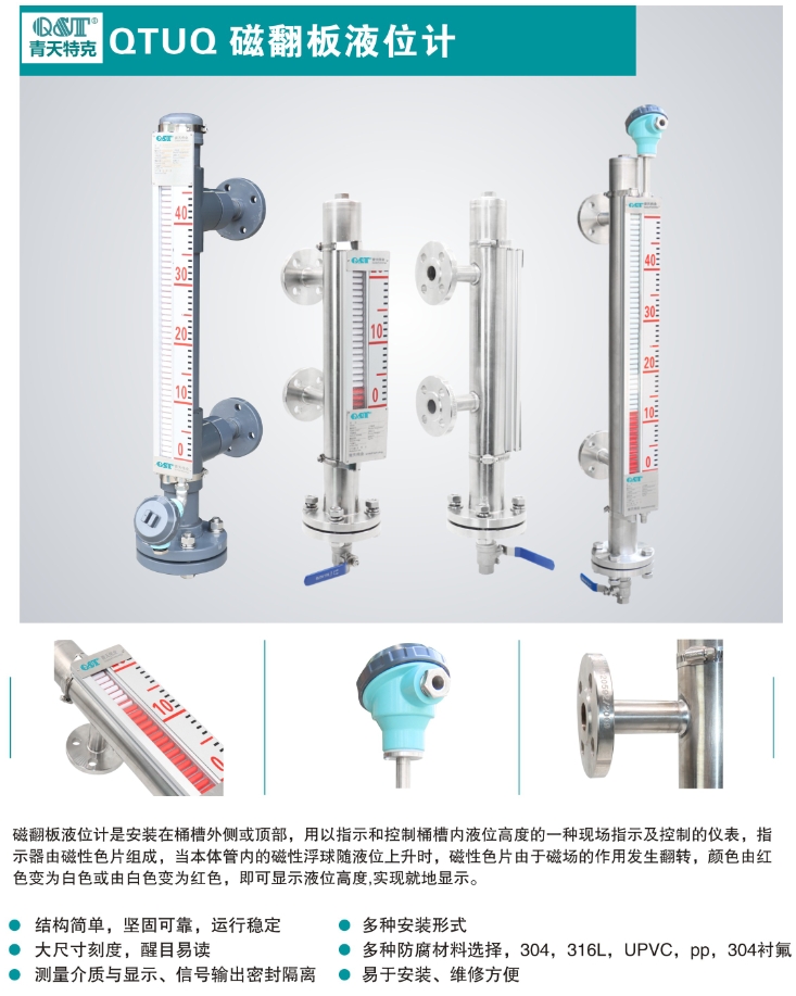 磁翻板液位計(jì)儀表可用于各種塔、罐、槽、球型容器和鍋爐等設(shè)備的介質(zhì)液位檢測。該系列的液位計(jì)可以做到高密封,防泄漏和適用于高溫、高壓、耐腐蝕的場合。它彌補(bǔ)了玻璃板(管)液位計(jì)指示清晰度差、易破裂等缺陷,且全過程測量無盲區(qū),顯示清晰、測量范圍大。