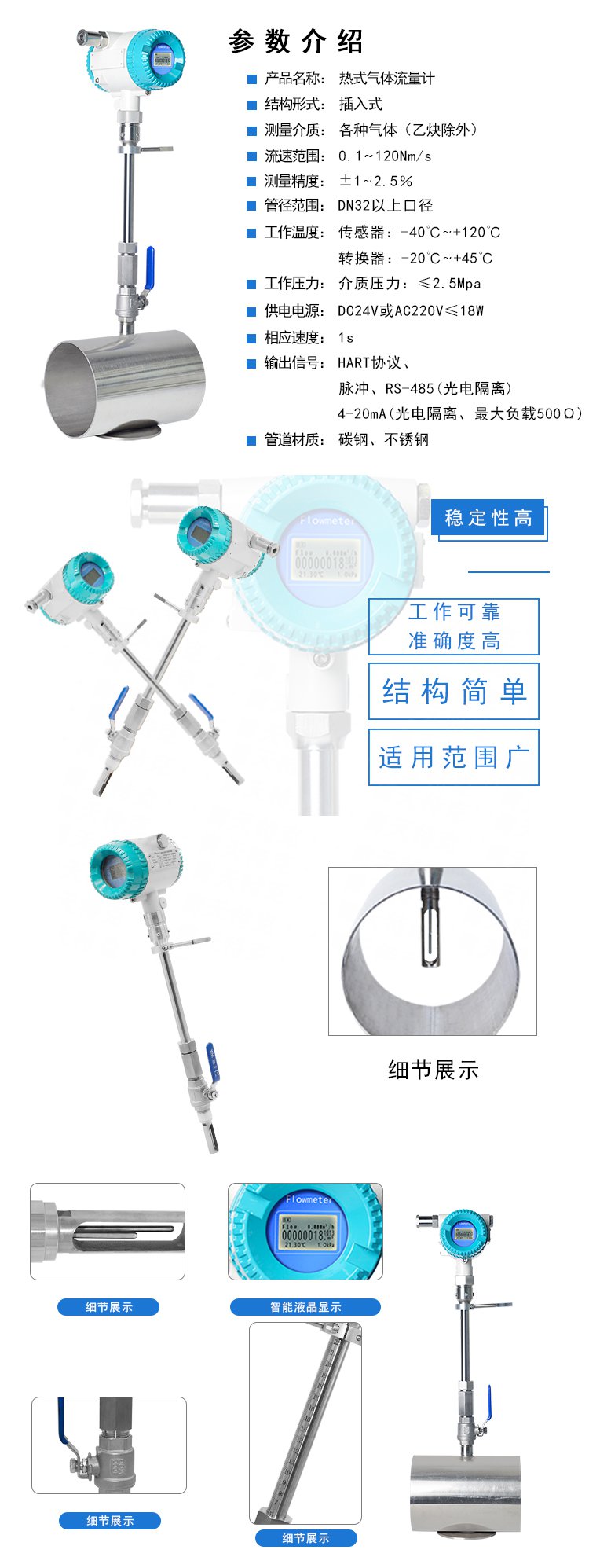 熱式氣體質量流量計由一體式流量轉換器、流量傳感器組成。按流量傳感器類型式分為:插入式和管段式熱式氣體質量流量計。