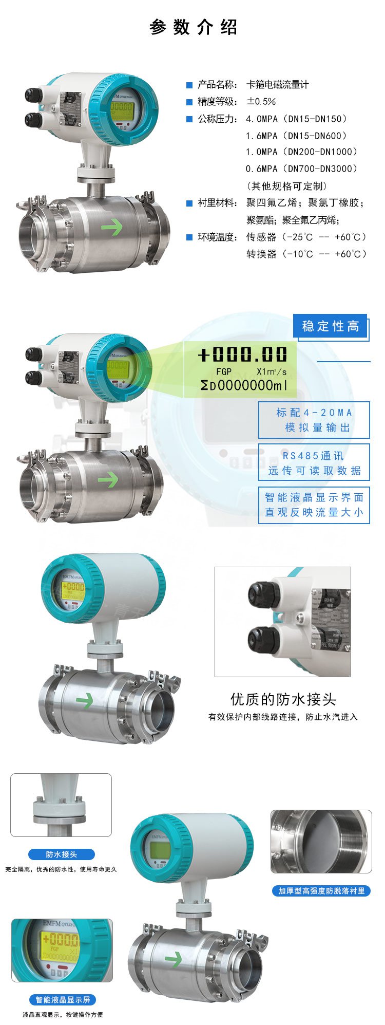 衛(wèi)生型卡箍式電磁流量計(jì)采用了新型的衛(wèi)生型襯里材料和襯里工藝,符合食品行業(yè)的衛(wèi)生要求,同時(shí)采用了不銹鋼外殼及不銹鋼卡箍連接,方便電磁流量計(jì)的快速拆卸、清洗,使電磁流量計(jì)在使用過(guò)程中不易被污染,且能有效防止測(cè)量流體殘余物在測(cè)量管中的堆積,可廣泛應(yīng)用于礦泉水、醬油、果醬、啤酒、果汁、米酒、牛奶等食品的生產(chǎn)制造過(guò)程及衛(wèi)生、化工等領(lǐng)域。